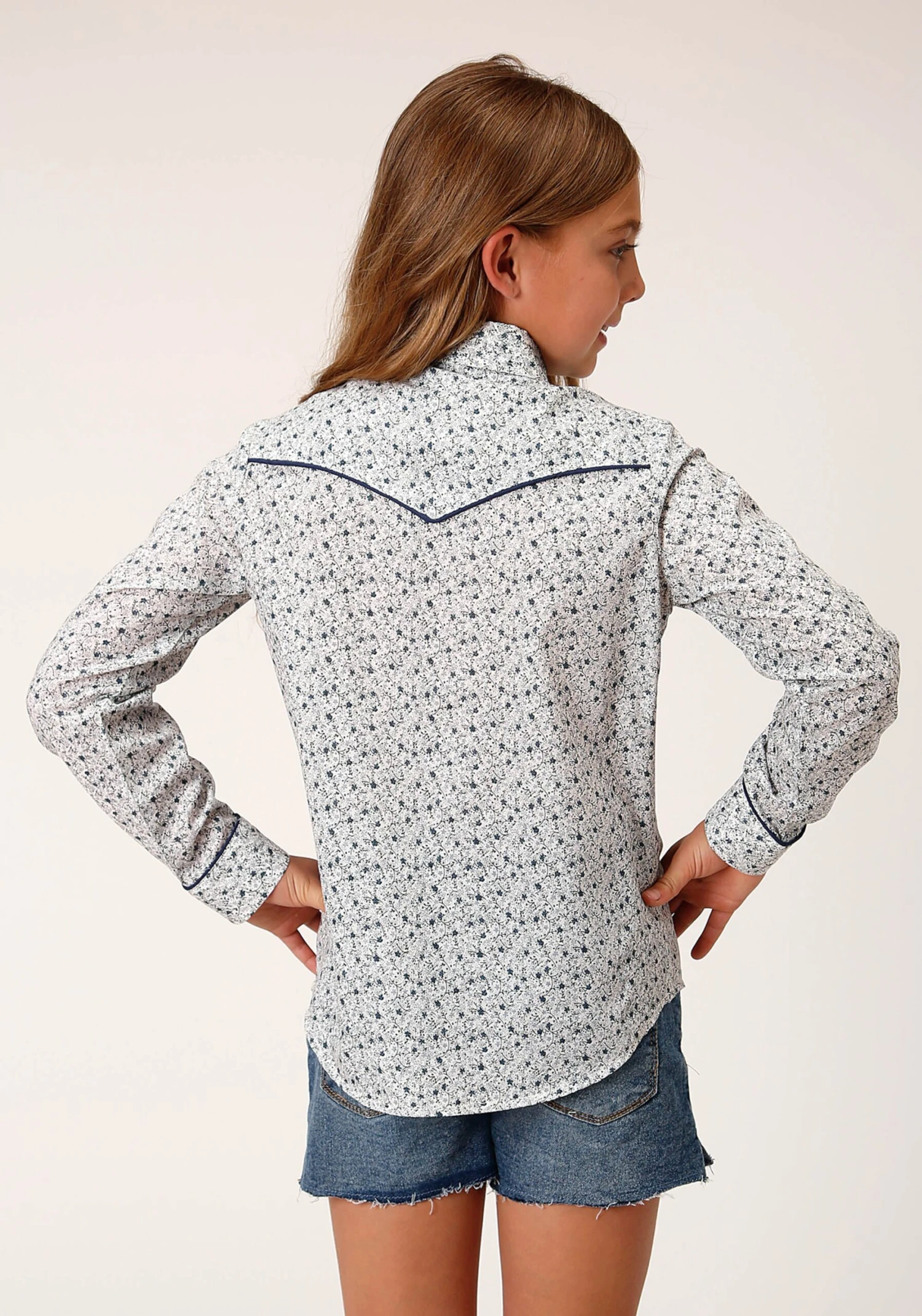 Girl’s Long Slv Western Style Shirt * Curved 1 Pt Back Yoke * Floral Printed Cotton/Poly Broadcloth Trimmed W/Solid Navy Piping * Smile Pockets, No Emb Arrow Points * 1 Snap Cuff