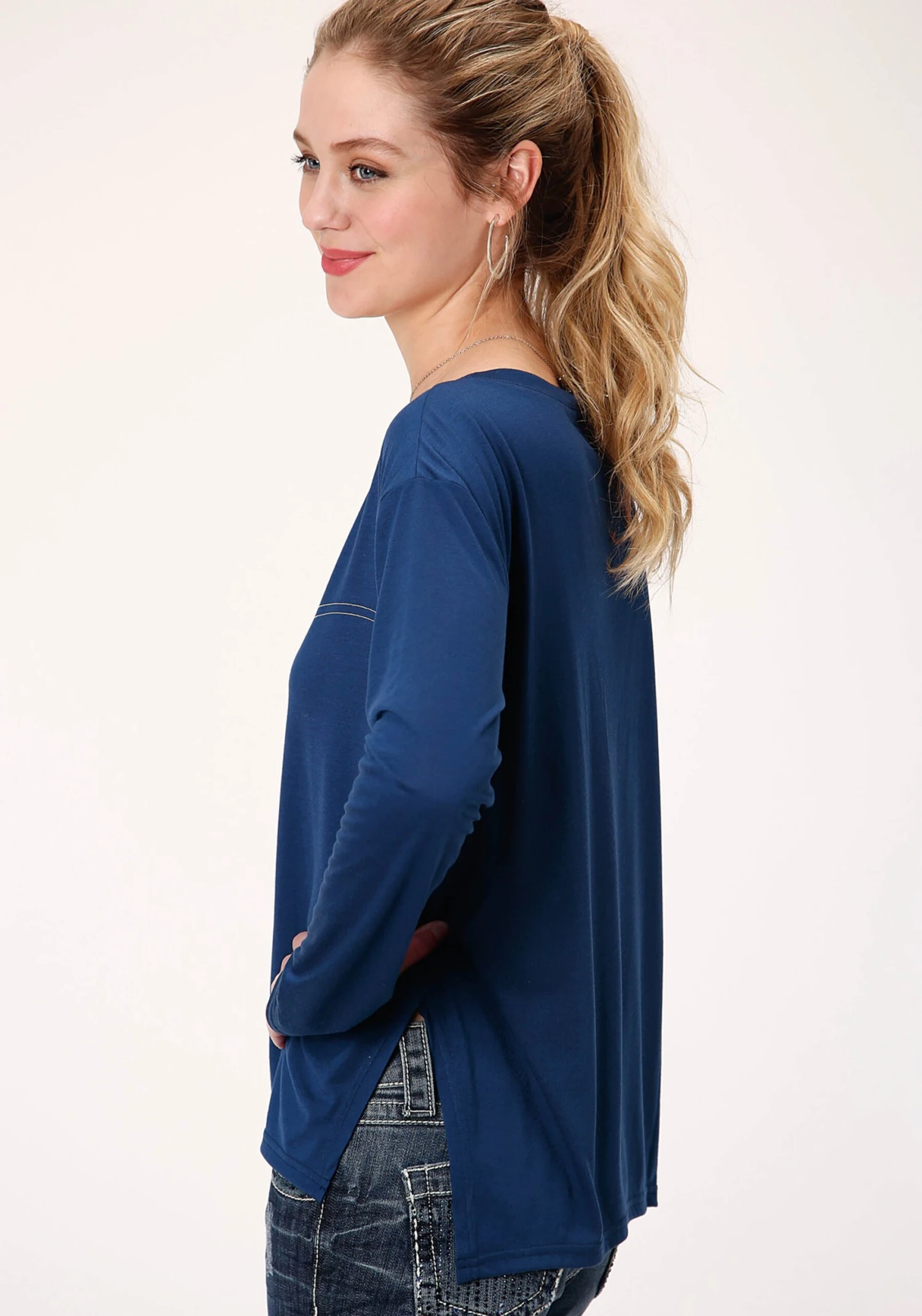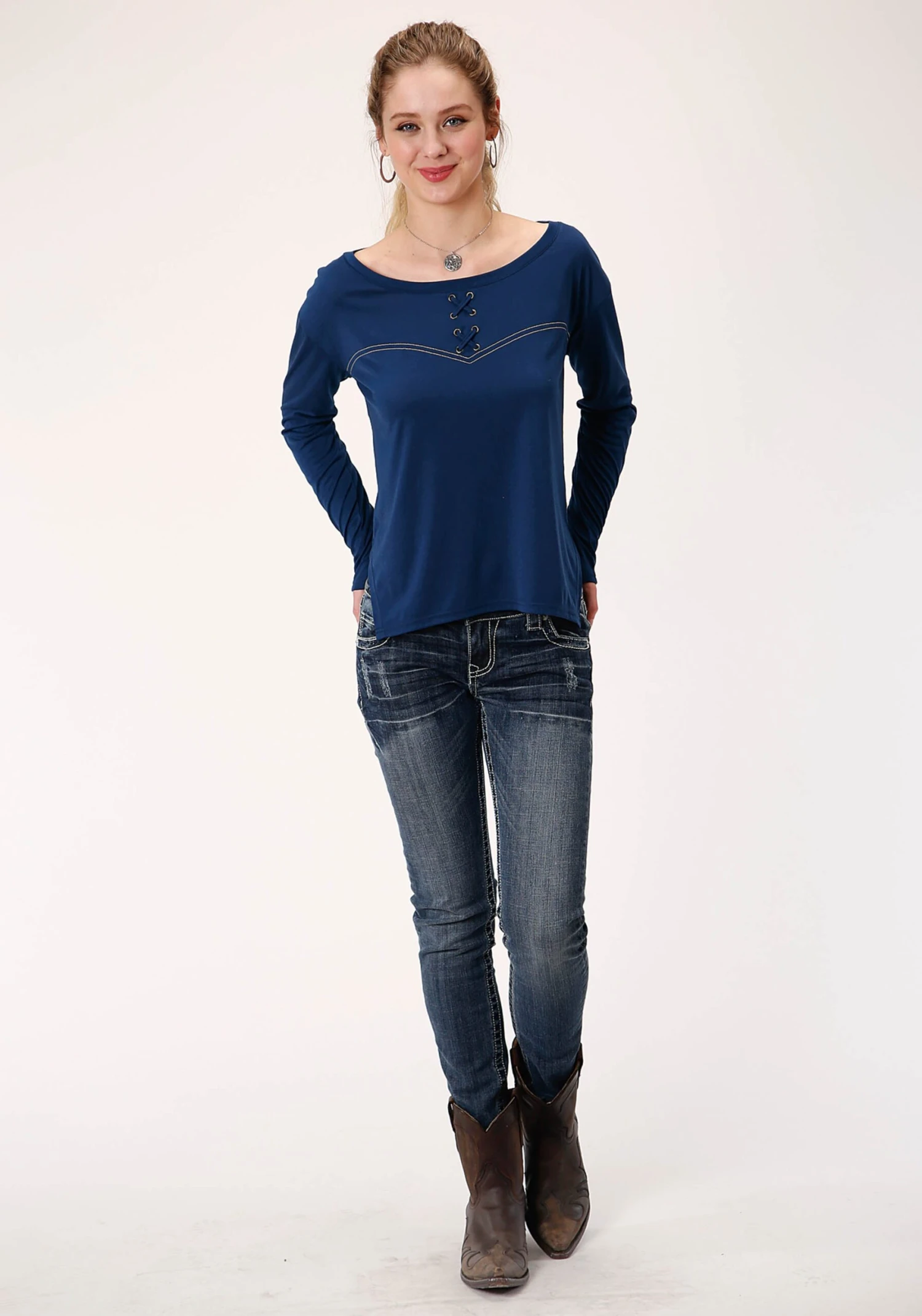 Women’s Navy Jersey Knit Scoop Neck Top * Long Sleeve * Faux Front Yoke Contrast Stitch Detail * Front Grommets With Self Cross Straps * Hi-Low Hemline * Boxy Relaxed Fit * Garment Washed For Softness