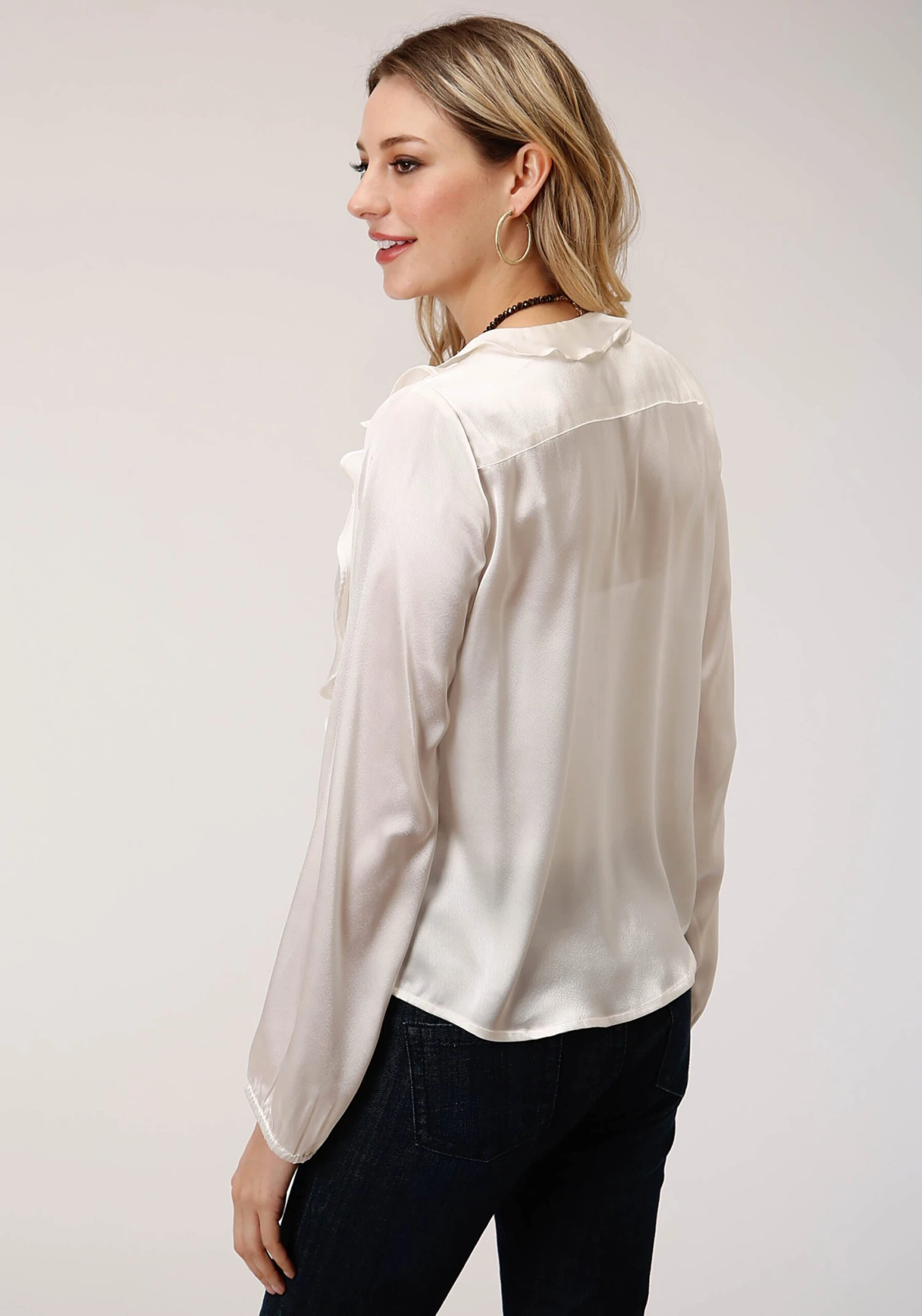Women’s Very Feminine Blouse In Soft Poly Satin * Ruffle Trim On Neck And Princess Seams * Wrap Front With V-Neckline