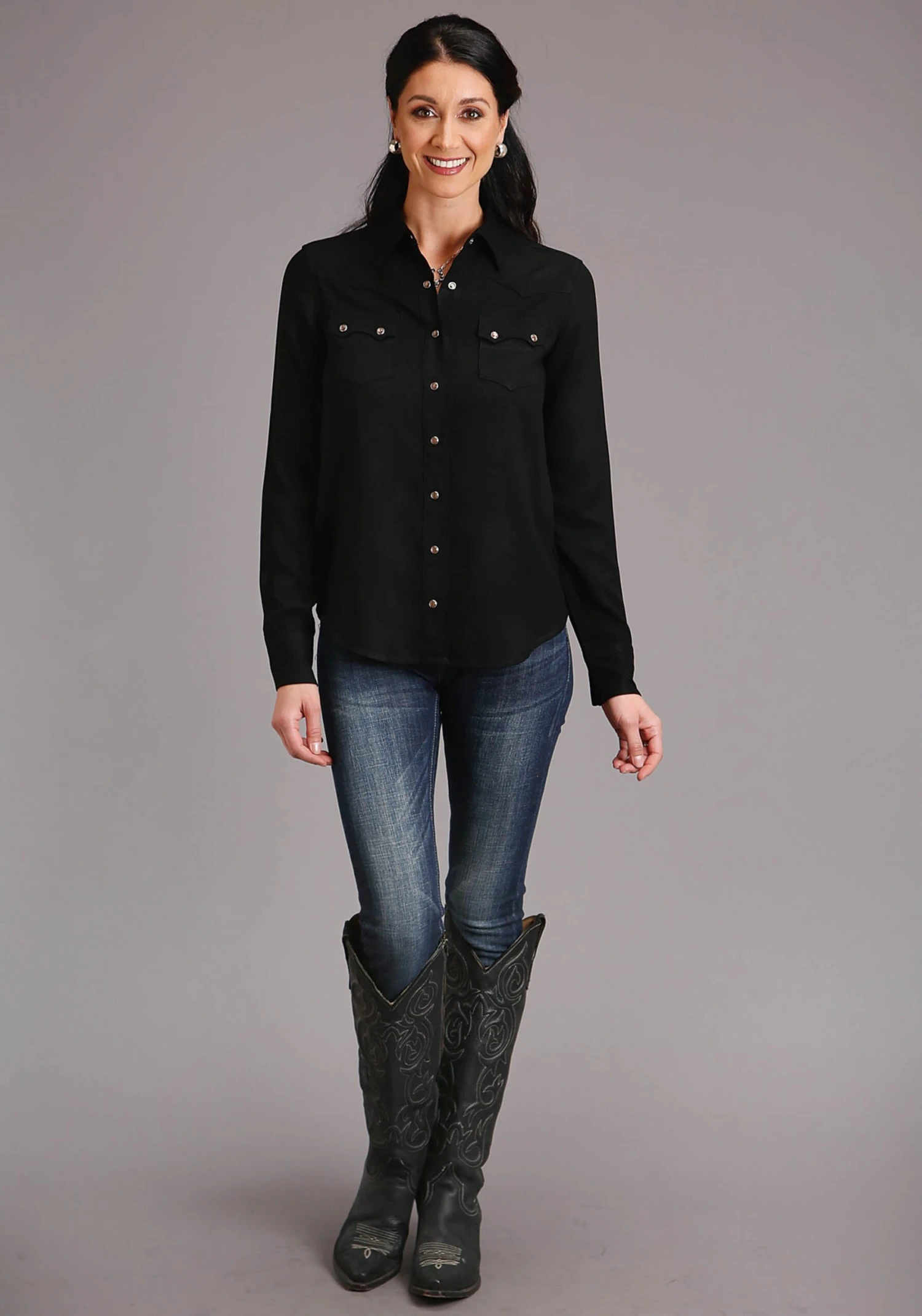 Women’s Black Rayon Crepe Western Blouse * Single Point Curved Front Yokes And Front Pockets With Double Point Curved Pocket Flaps And Snap Closures * Double Point Curved Back Yoke * 3 Snap Closure Cuff