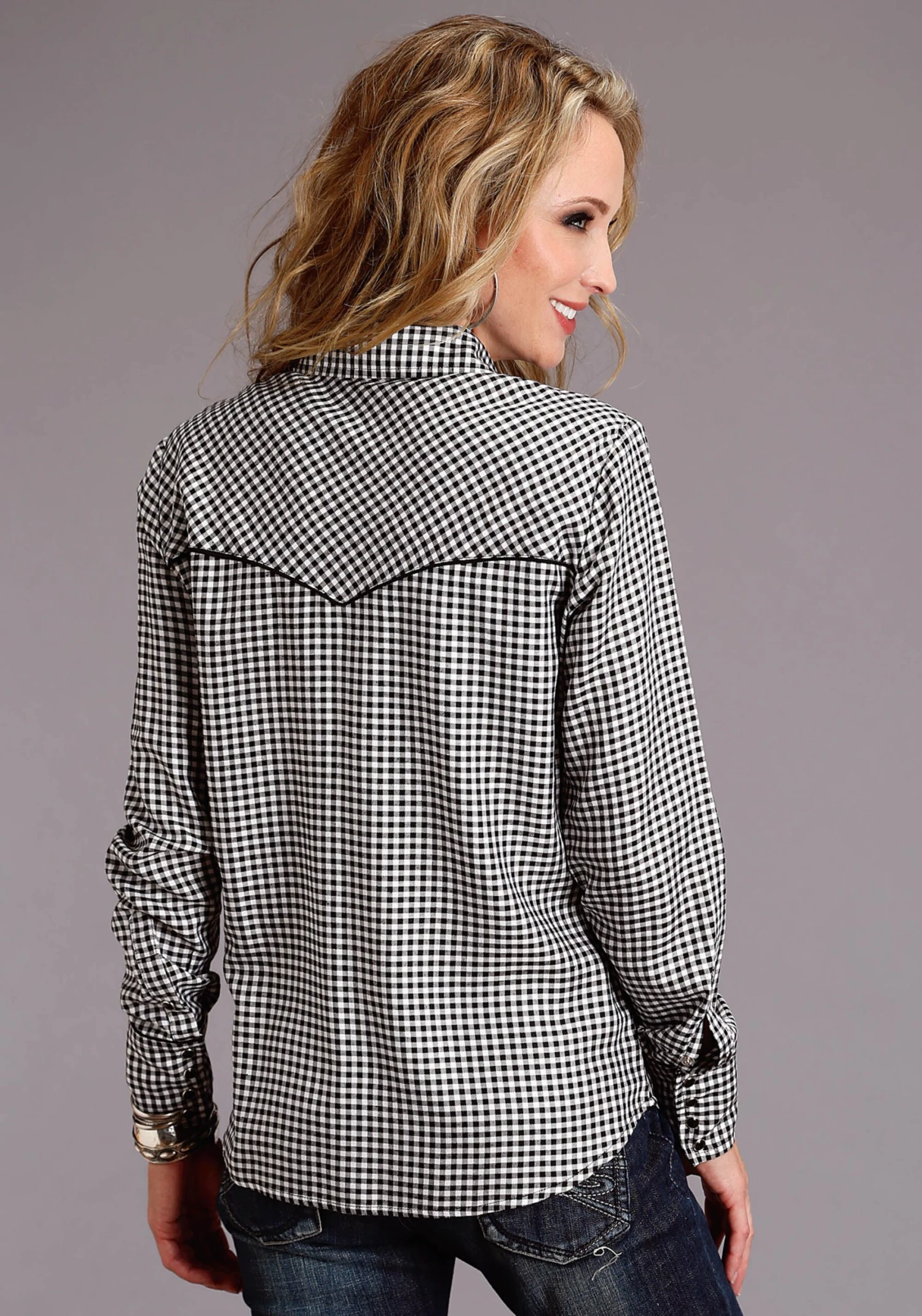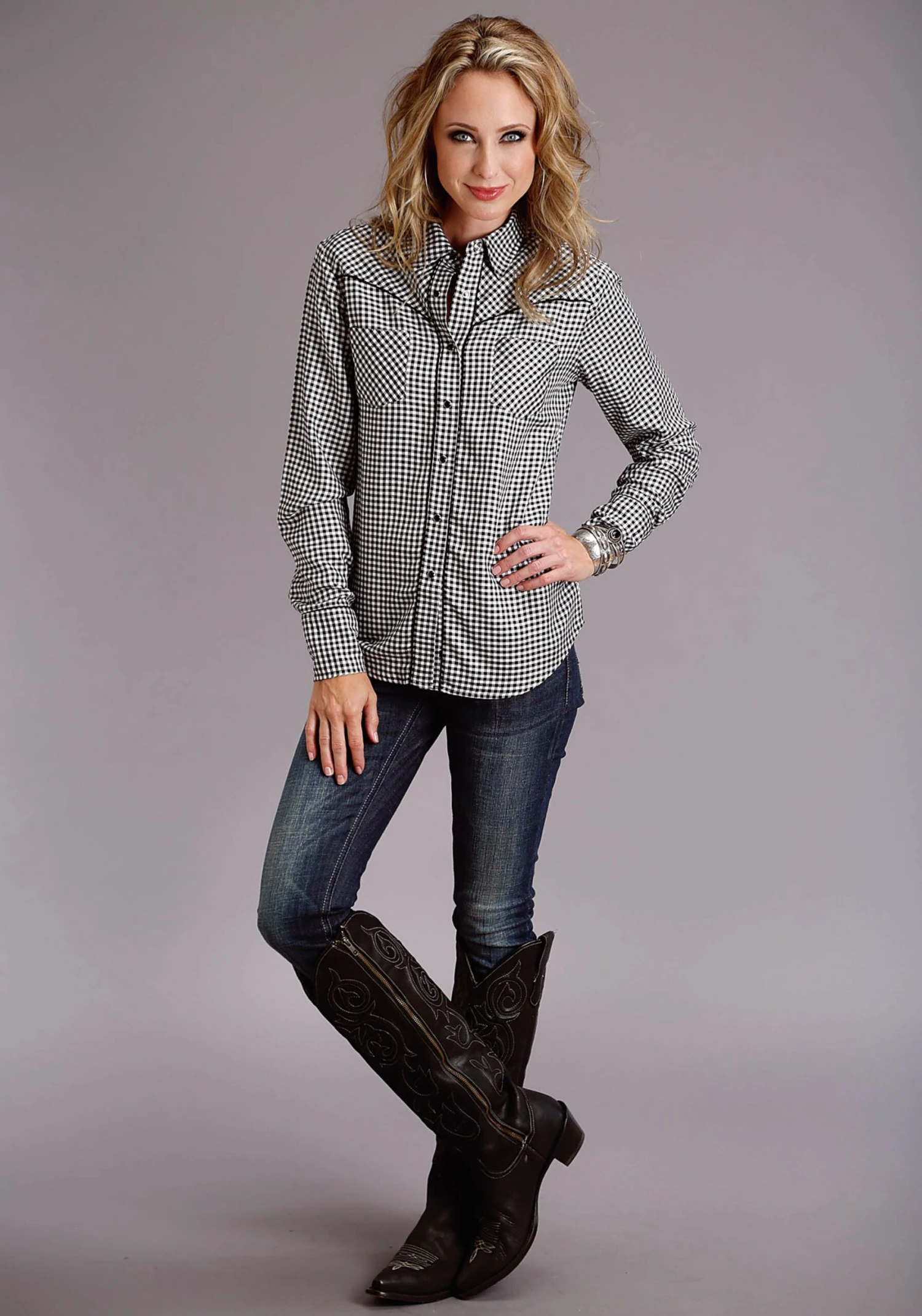 Black & White Gingham Check Western Shirt * Full Front Button Placket * Bias Cut Front Patch Pockets And Front And Back Yokes * 4 Button Cuffs