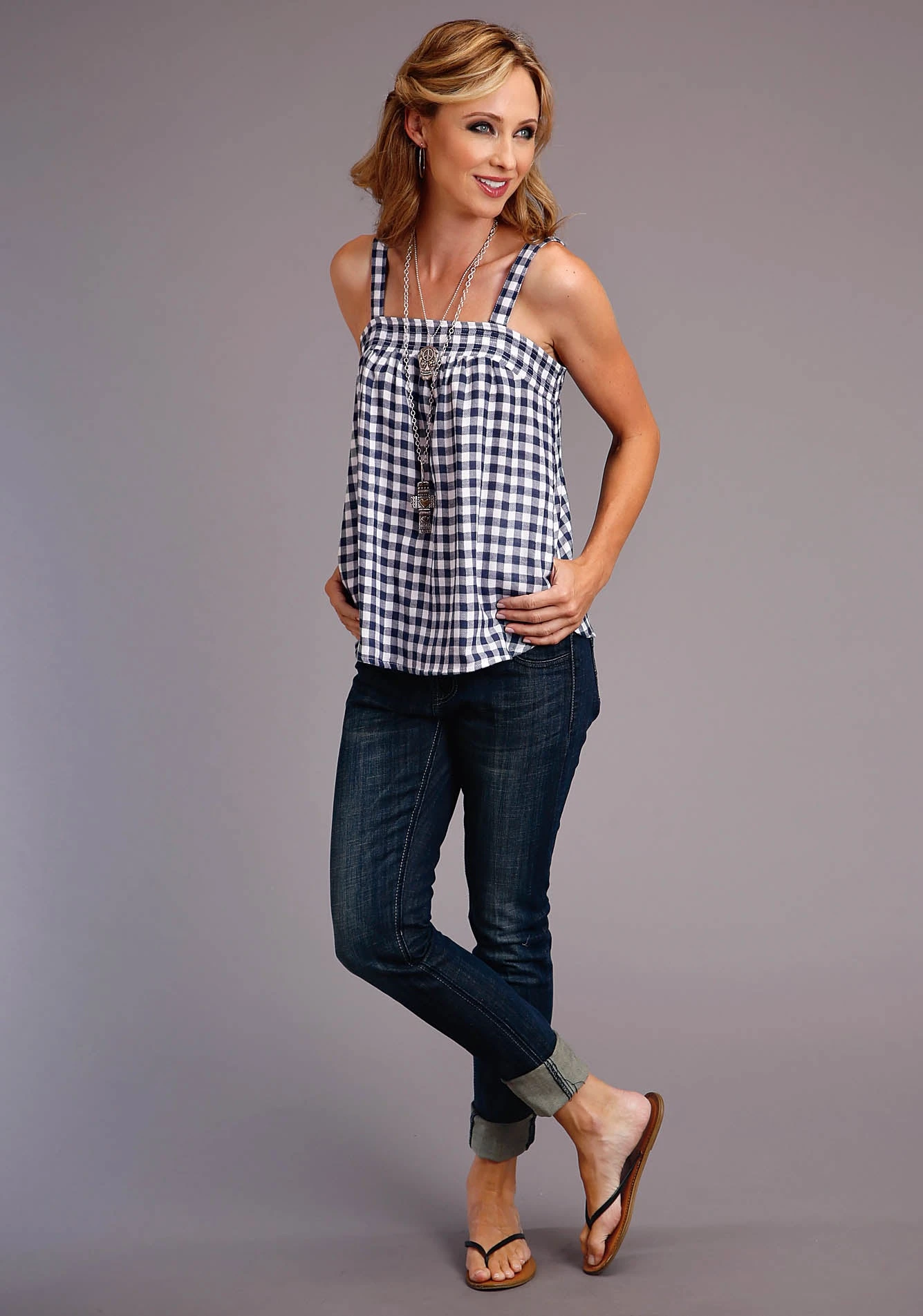 Navy And White Double Sided Gingham Camisole Style Top * Spaghetti Straps * Stitched Top Band And Straps * Elastic At Back Of Band * Gathered At Back * Side Seam Pockets