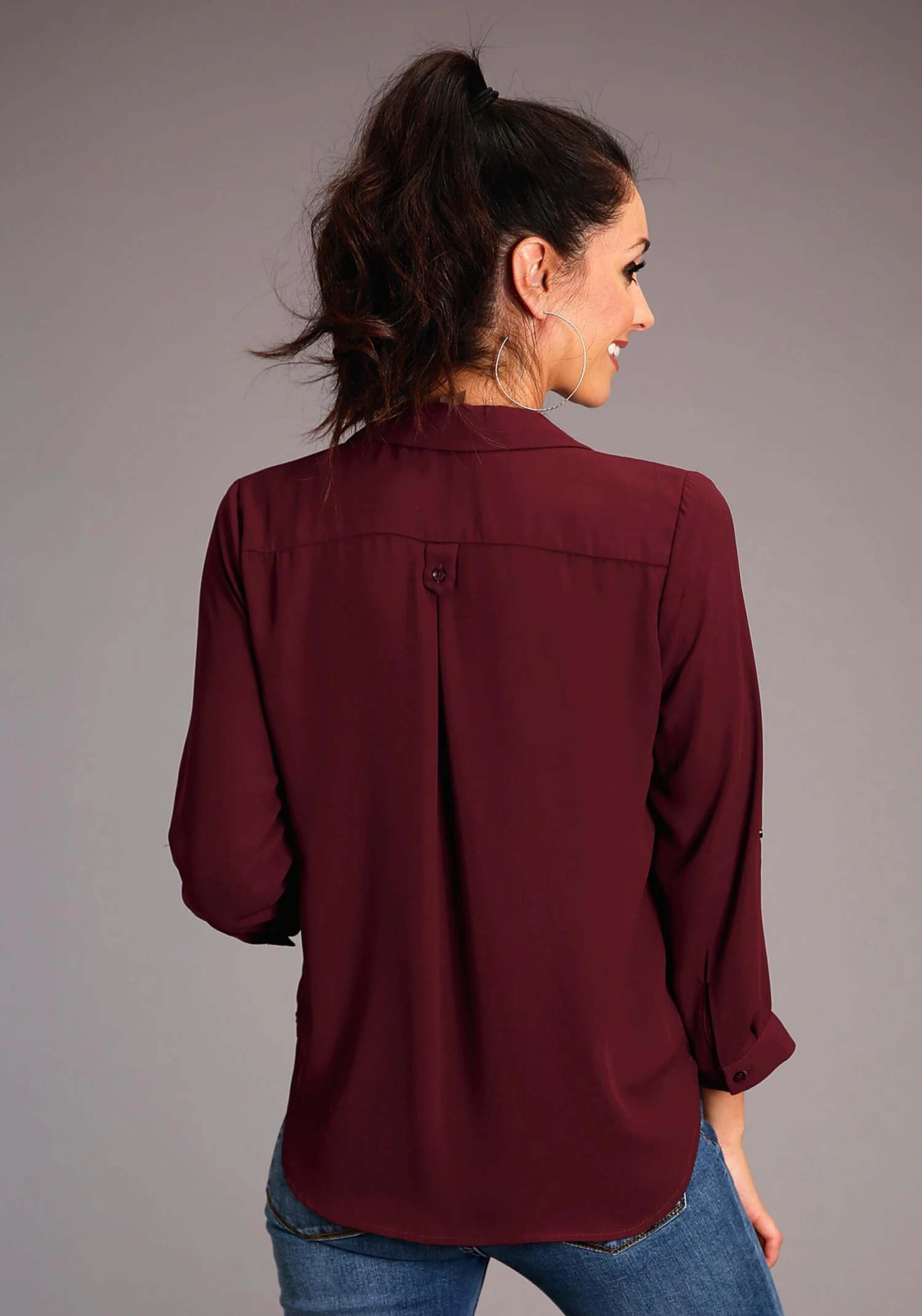 Women’s Wine Rayon Crepe 3/4 Sleeve Shirt Blouse * Open V Collar With 3 Button Placket * 2 Patch Pockets At Chest * Straight Back Yoke With Button Tab, And Pleat At CB * Button And Tab Sleeve Roll Option * Single Button Closure Cuffs